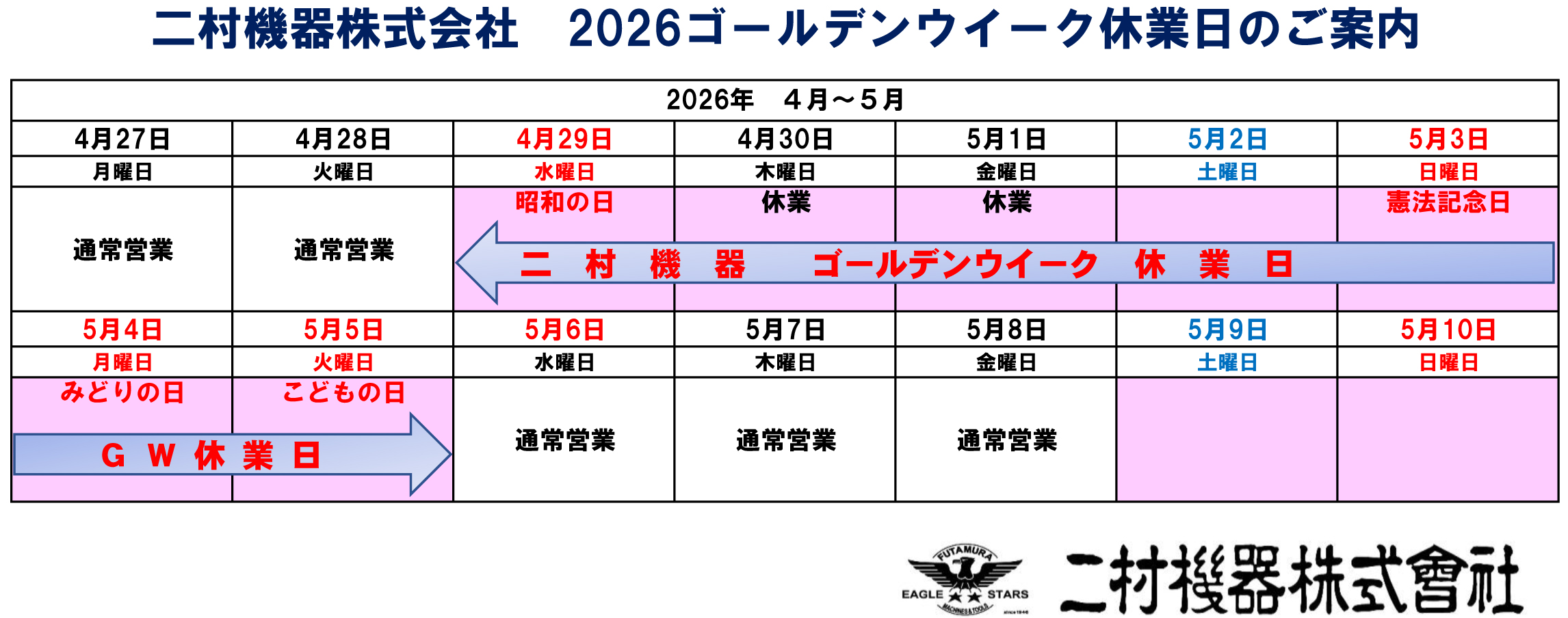 当社の休日は土曜日と日曜日の完全週休2日です。