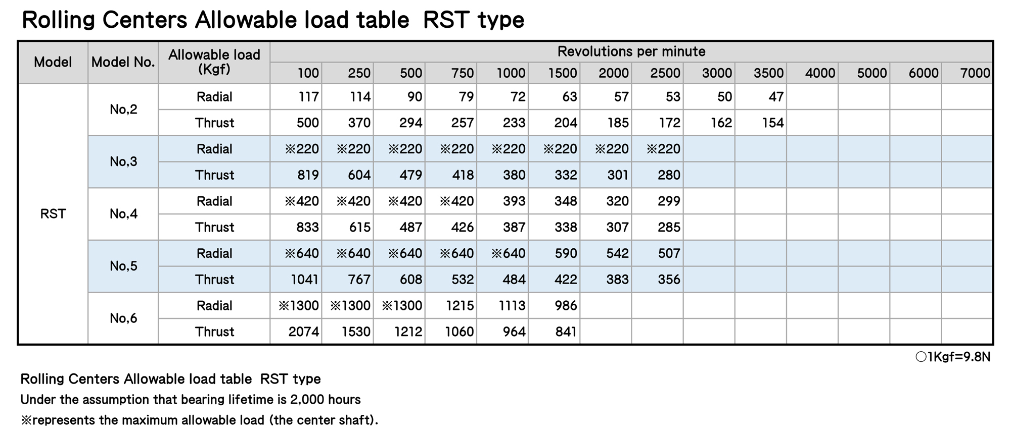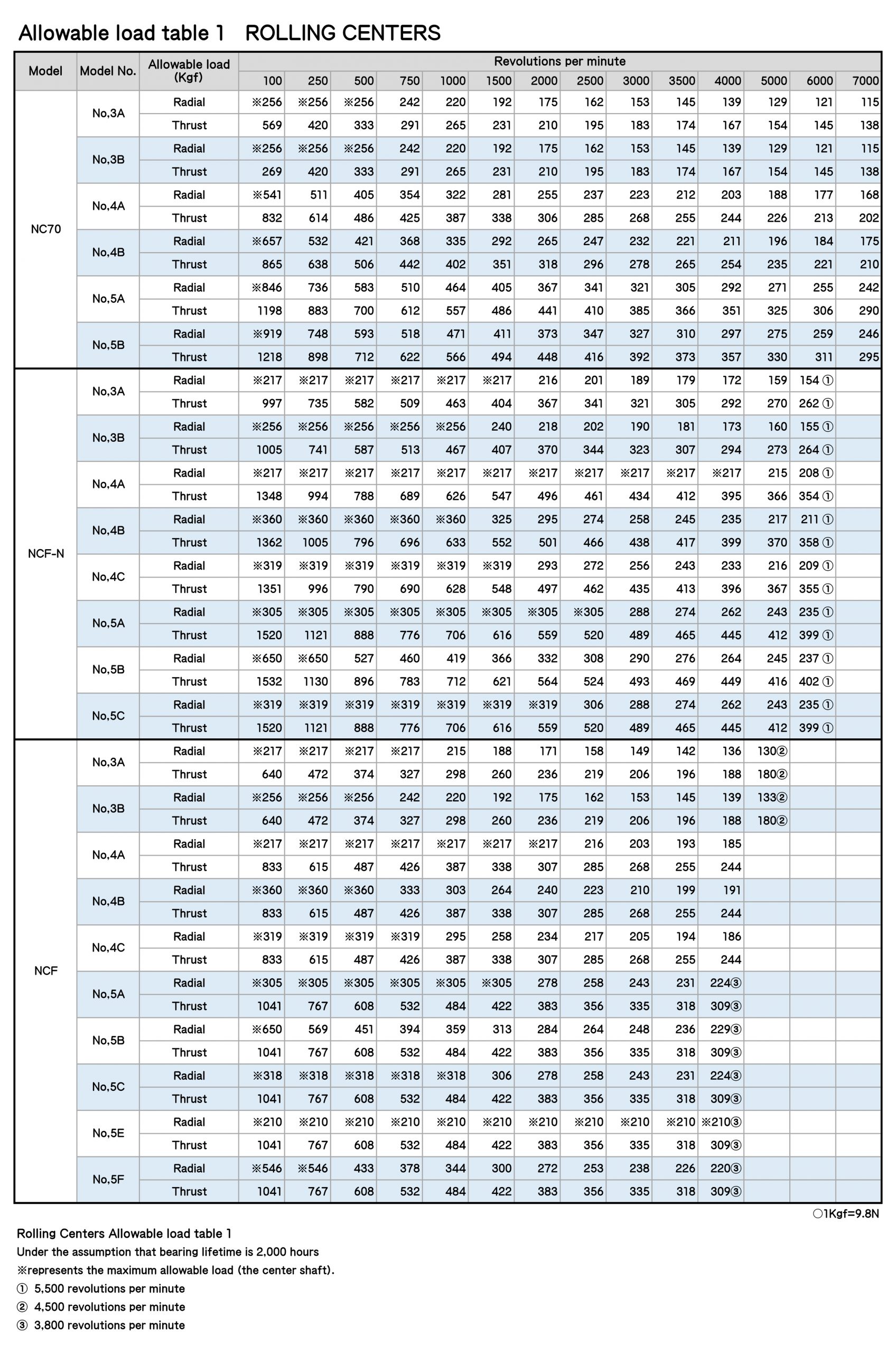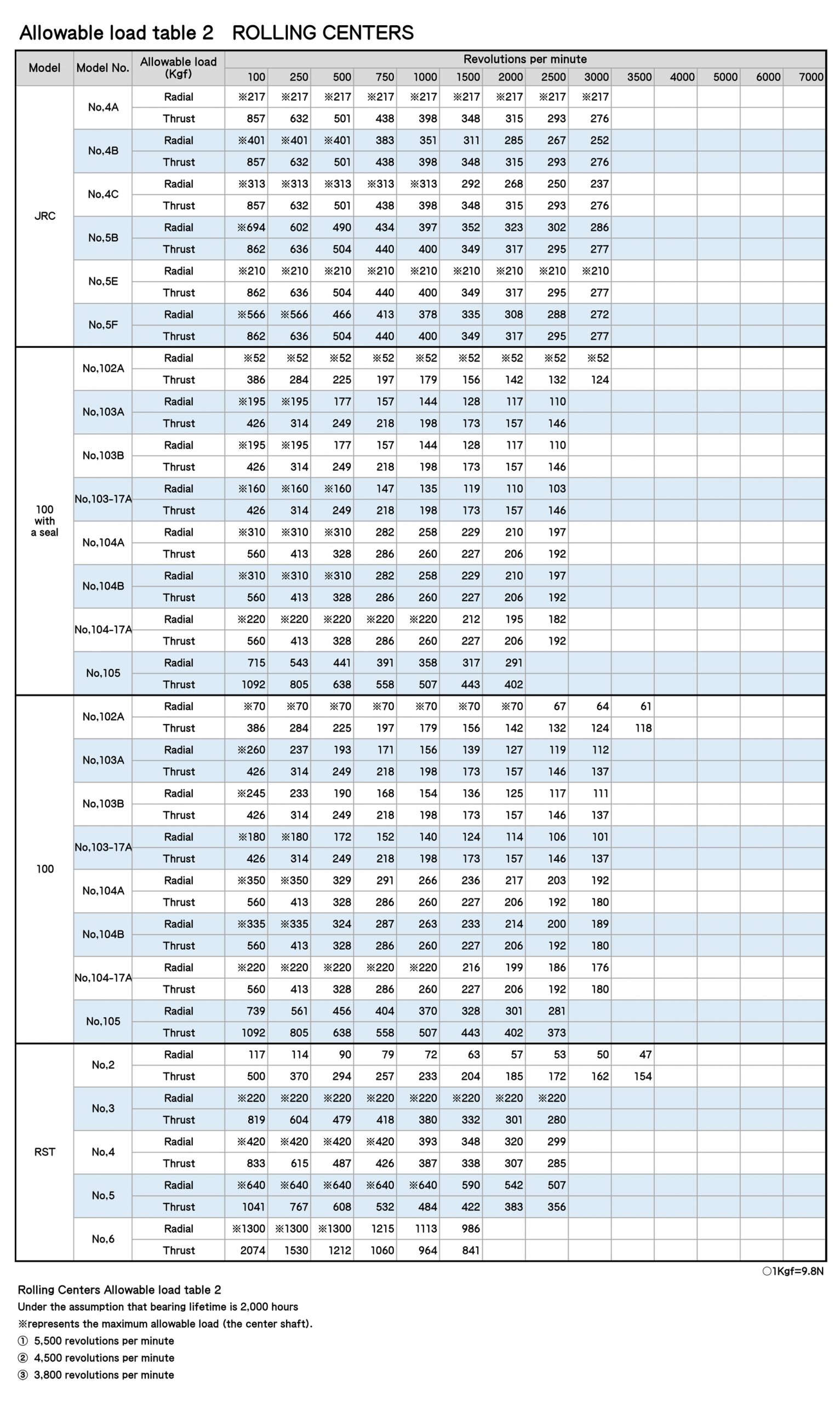 Rolling Centers Allowable load table