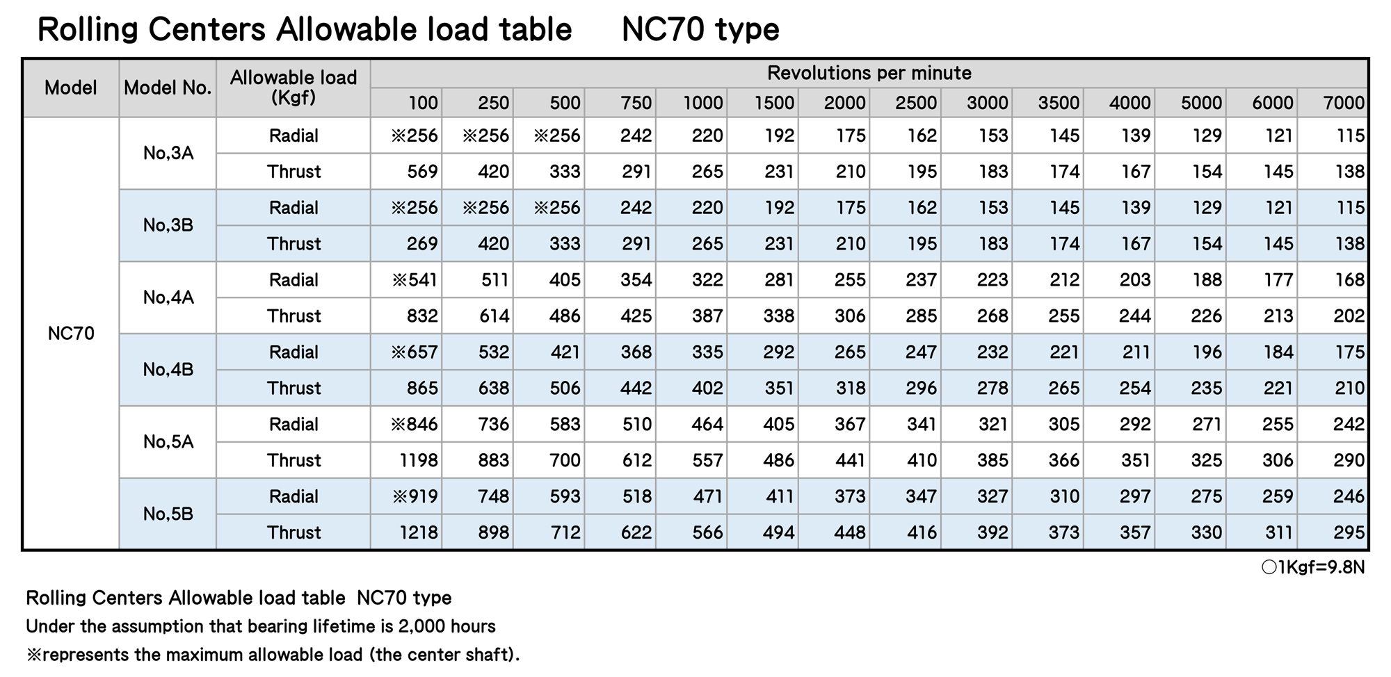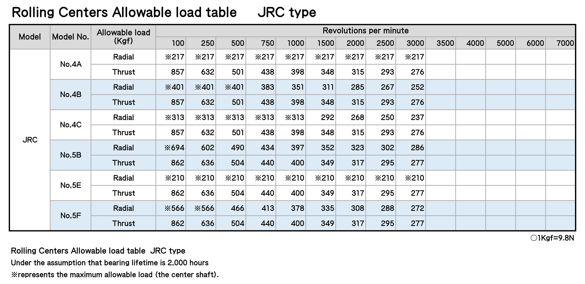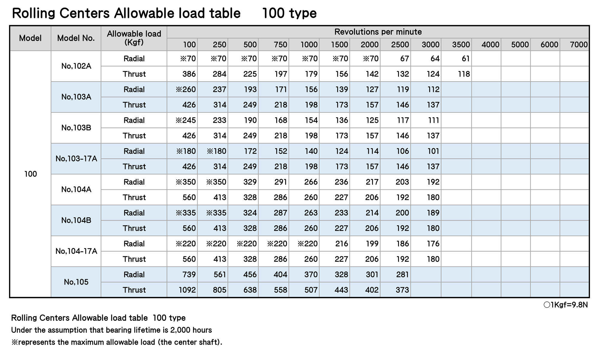 Rolling Centers Allowable load table
